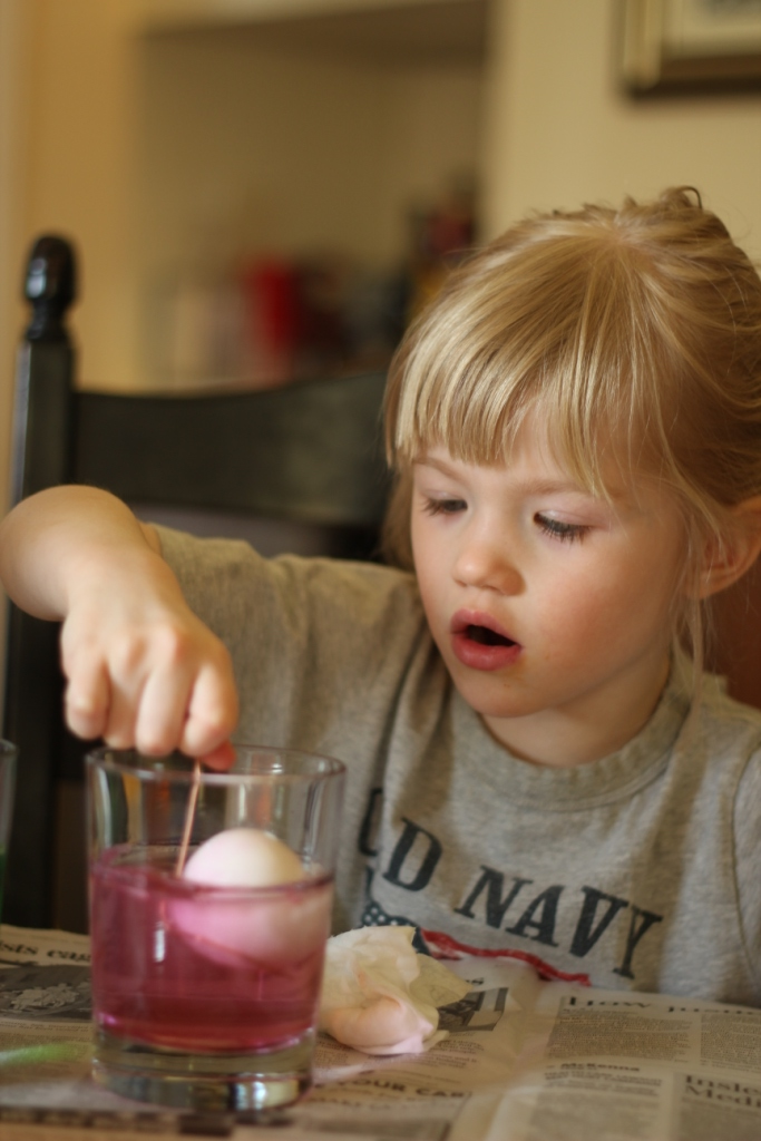 The day before Easter, we taught the kids how to dye Easter eggs. They were very excited to choose the colors for their eggs and watch the shells transform from white to the selected color. We found out on Easter that the kids are much more impressed with dying their eggs than eating them. Oh well!